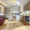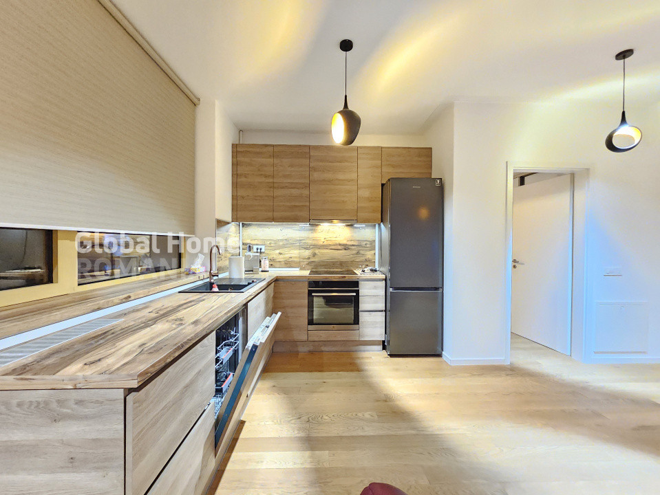 - Bucatarie complet echipata cu electrocasnice premium: plita electrica, cuptor electric, hota, frigider, masina de spalat vase