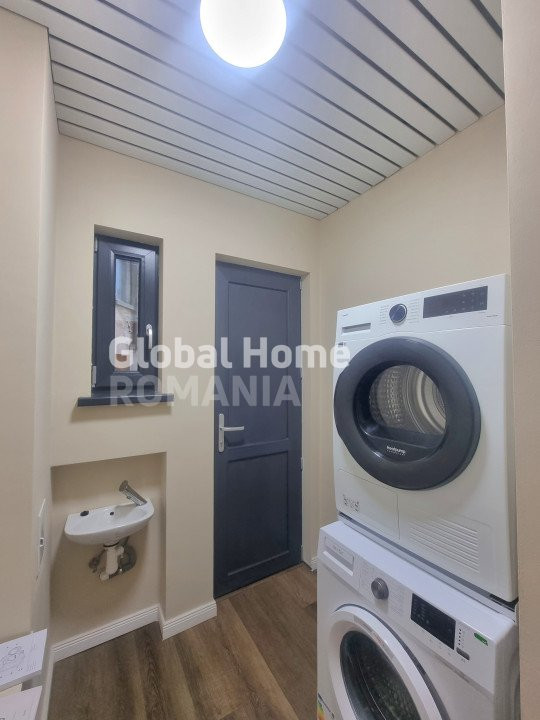 Dotată cu frigider, plită, cuptor, hotă și mașină de spălat.
