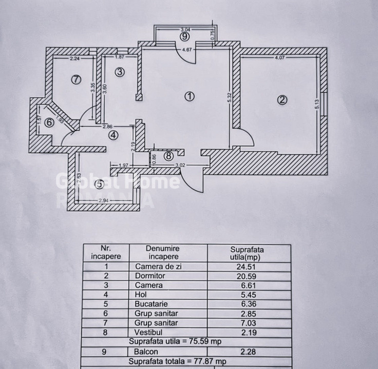 Apartamentul are o suprafață utilă de 75,59 mp la care se adaugă balconul de 2,28 mp.