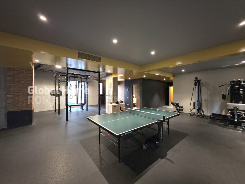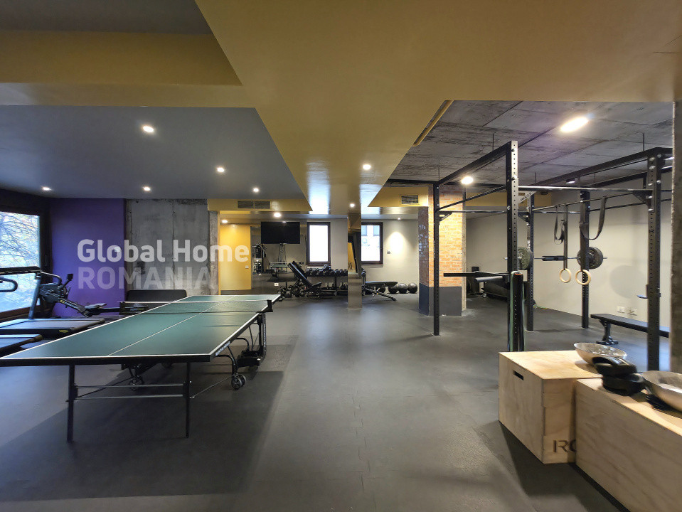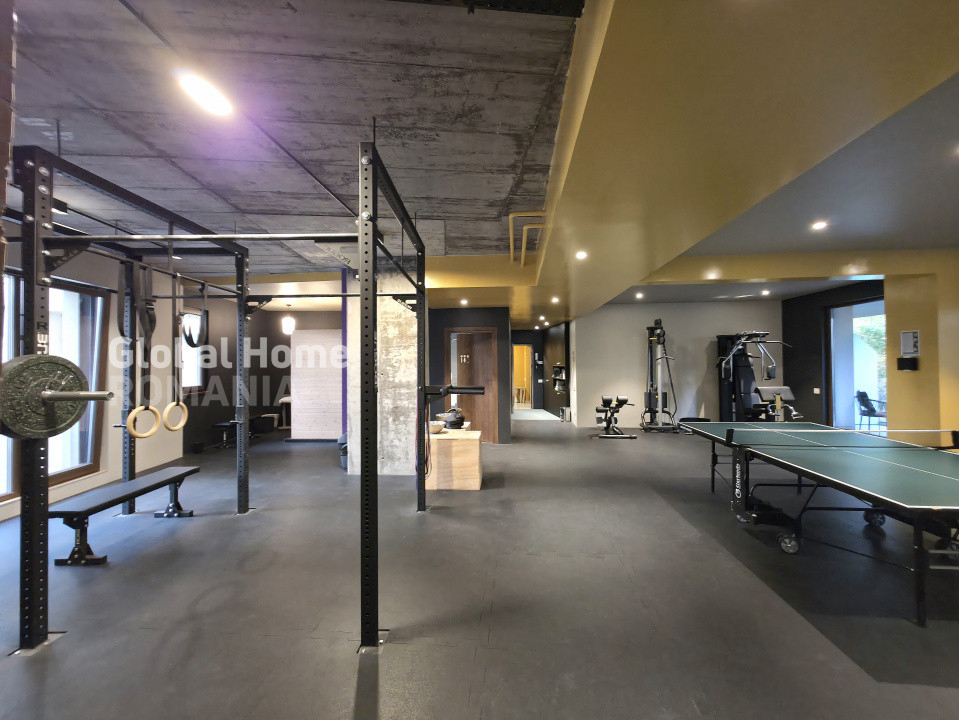 Sală de fitness complet echipată, zonă de relaxare, dușuri, TV smart, sistem audio profesional, apă și prosoape – toate gândite la standard hotelier.