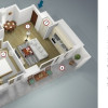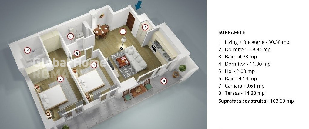 Compartimentarea este eficientă și cuprinde living spațios cu bucătărie open space, dormitor secundar ce poate fi folosit și ca birou, baie pentru zona de living și pentru dormitorul secundar, dormitor matrimonial cu dressing și baie proprie, precum și o terasă de 15,80 mp care poate fi accesată din fiecare cameră.
