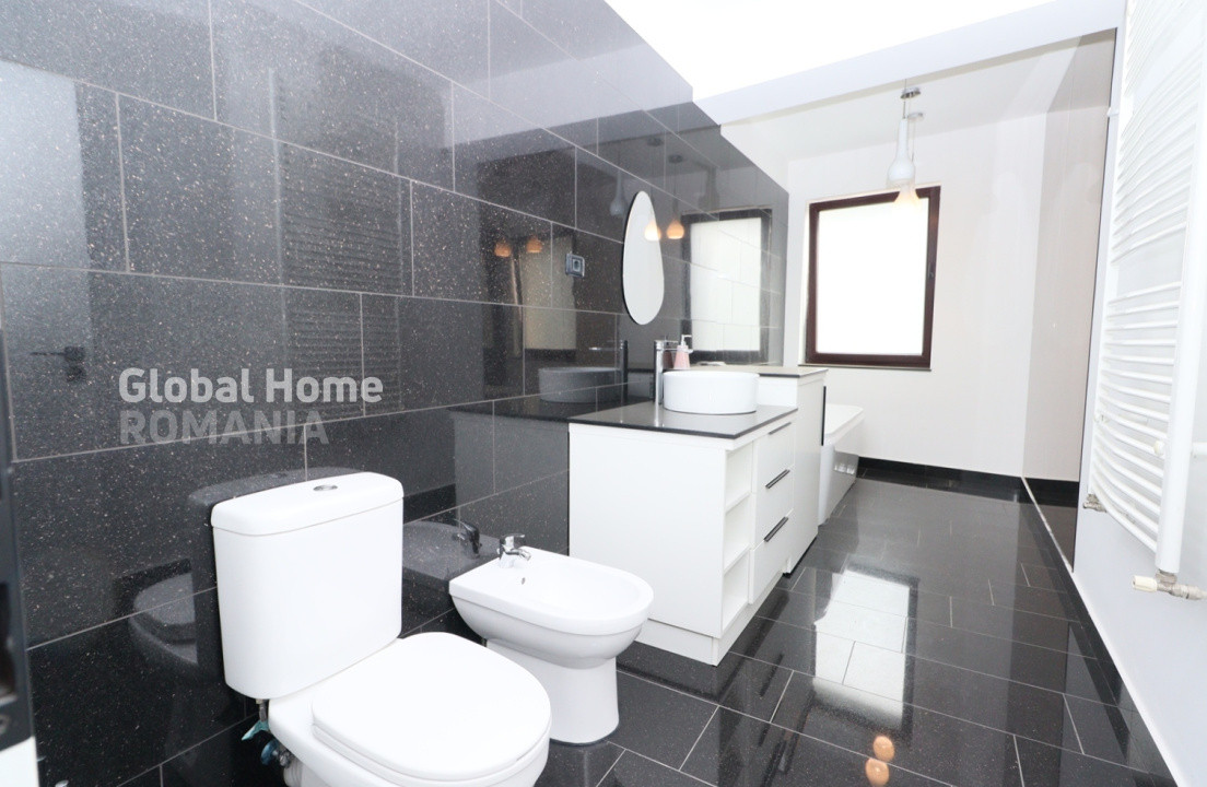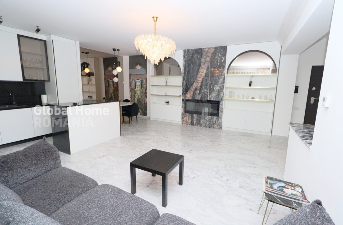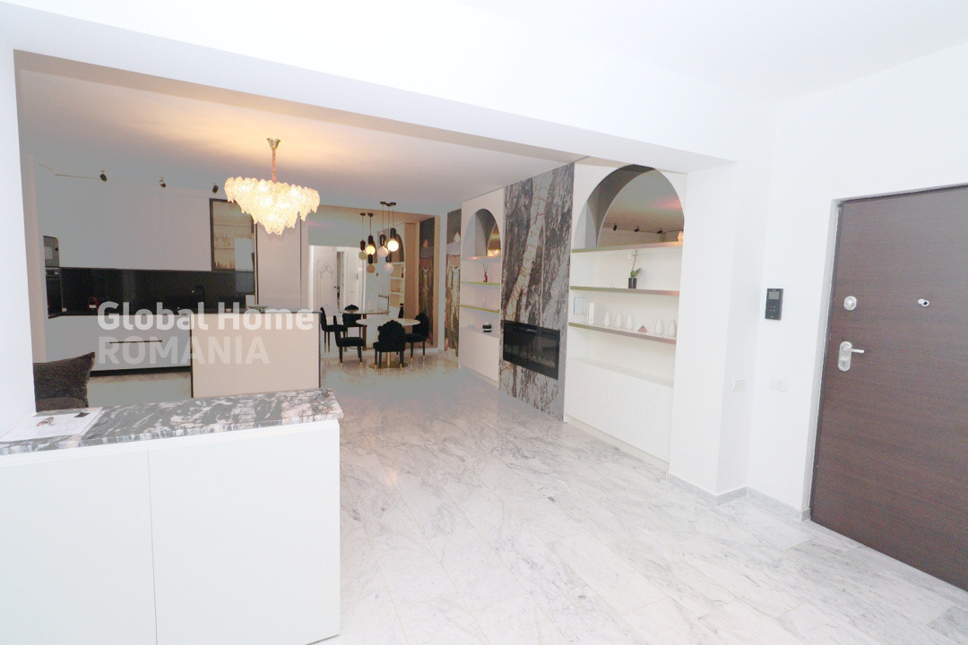 -complet mobilat si utilat: mașină de spălat, mașină de vase, frigidere, plită, cuptor, hota, TV. Mobilier din MDF, semineu de Quartz, blaturi de granit, marmura Cararra pe toata suprafata apartmentului. Uși Filomuro, canapea Edra, masa dining marmura, baie serviciu placata cu marmura, baie matrimoniala placata cu granit.