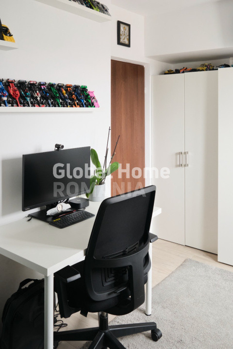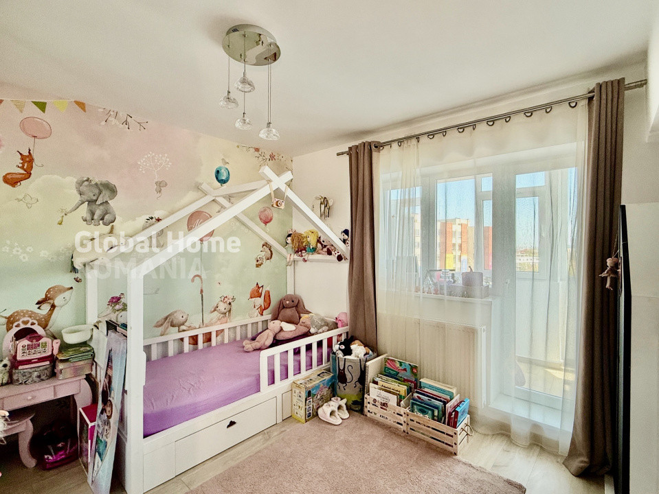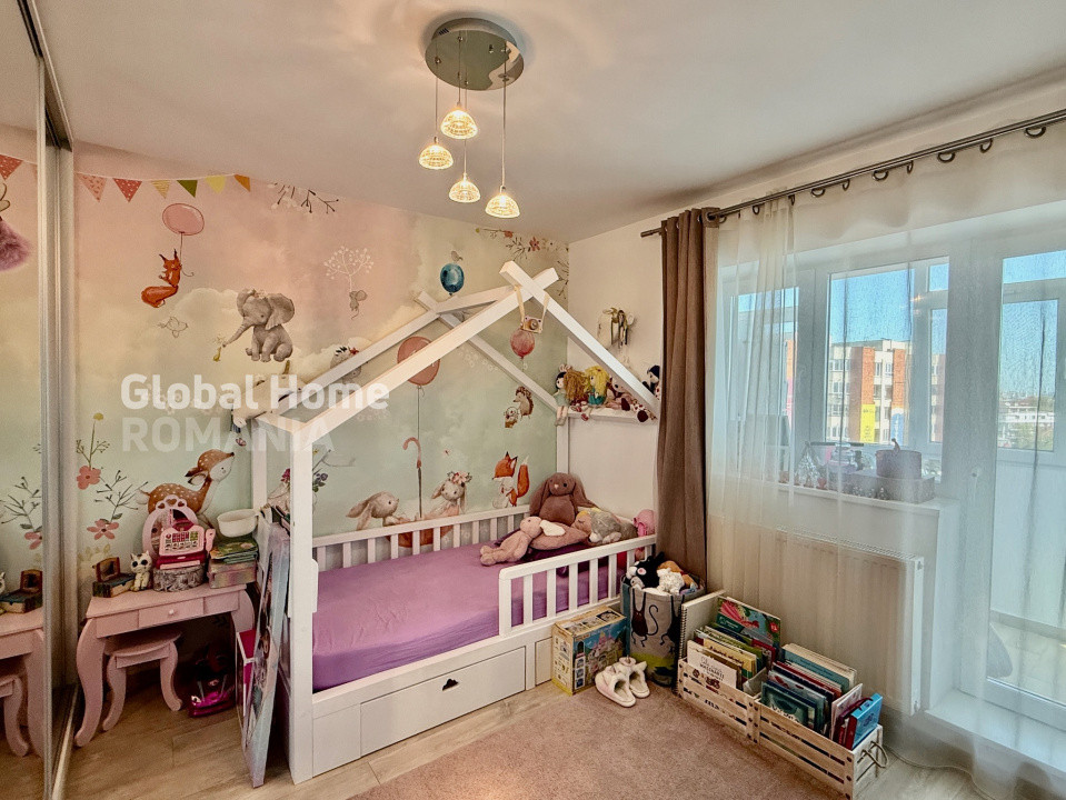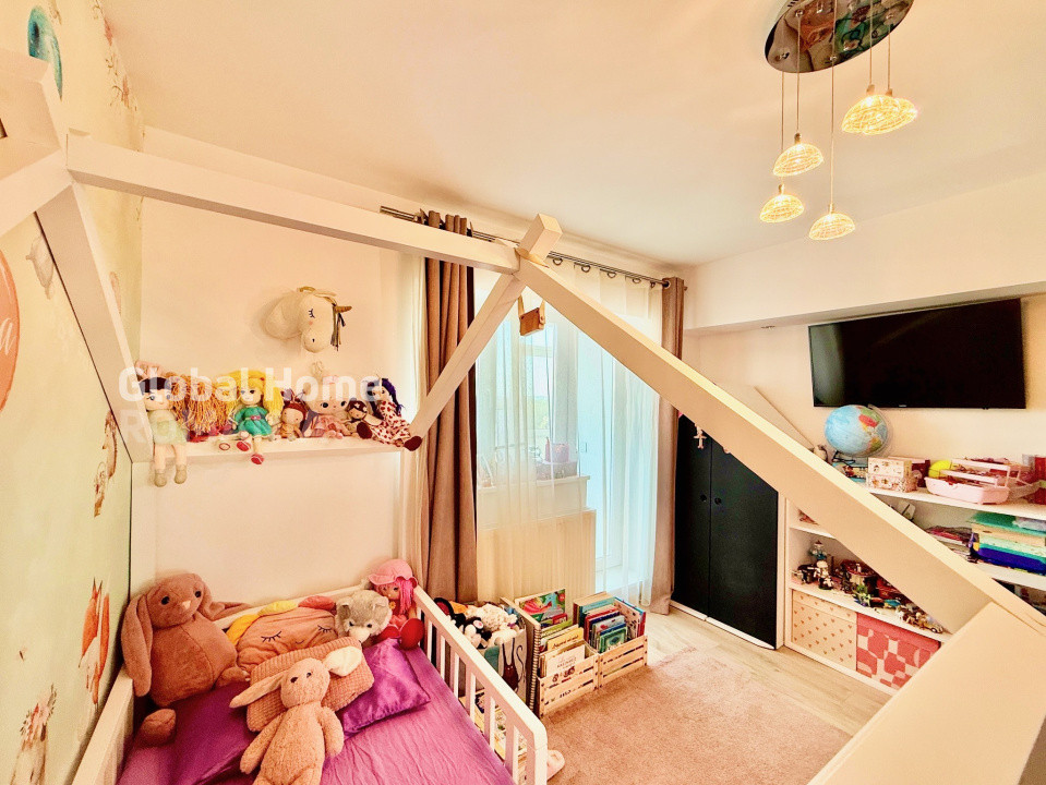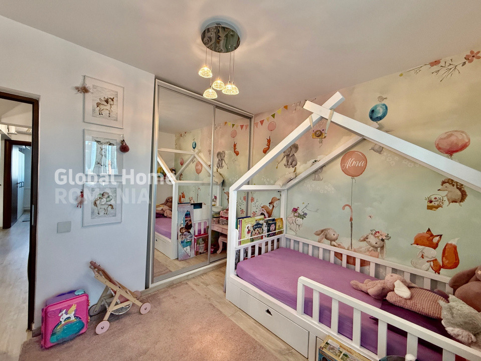 * separare ideală pentru liniște și intimitate - dormitor matrimonial și dormitor pentru copil, amenajat cu mobilier realizat pe comanda pentru confortul și dezvoltarea optima a unui copil.