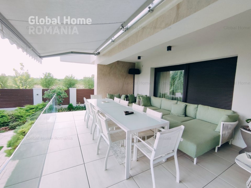 - Terasa cu pergola, dotata cu canapea extensibila si zona de servit masa